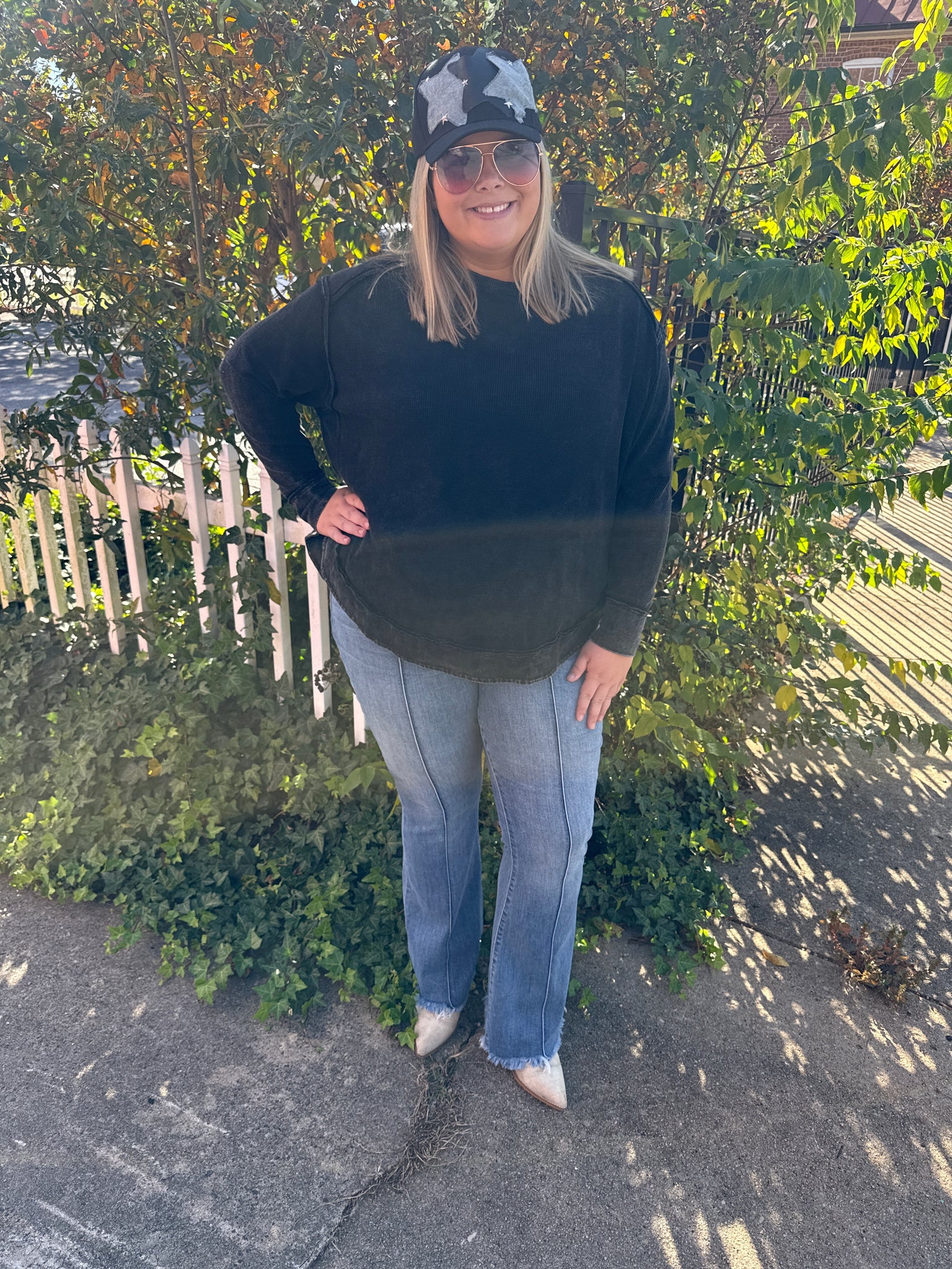 This oversized knit top combines comfort with subtle detailing for a modern look. Featuring a mineral-washed finish and elbow patch contrast, it adds texture and visual interest. The long sleeves, round neck, and raw edge details contribute to its relaxed yet refined style, while the round hem ensures a flattering silhouette. Ideal for layering or wearing solo, this piece delivers effortless versatility with an expert touch.
