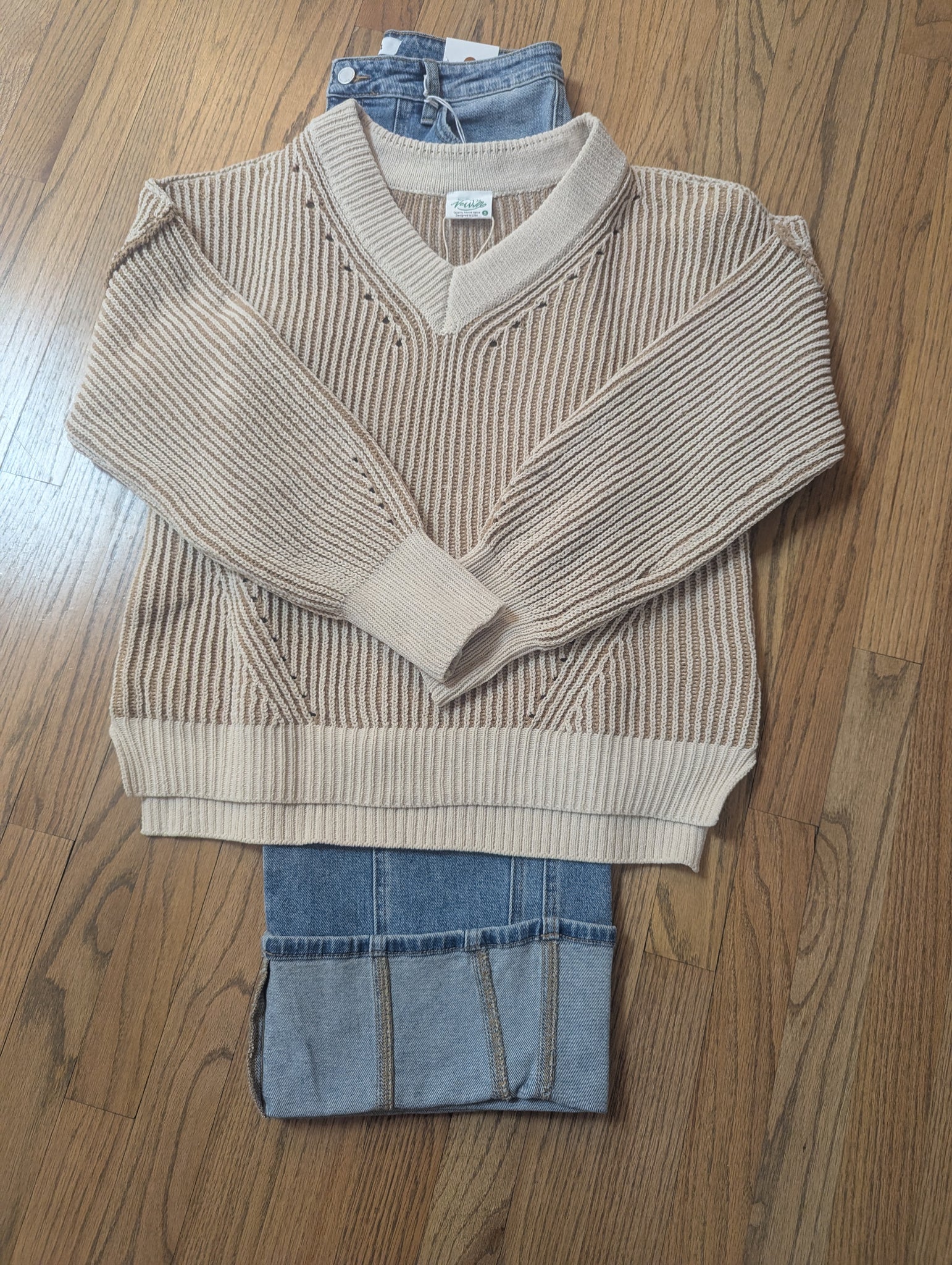 Cozy up in style with this oversized two-tone knit sweater! Featuring a playful hole detail and a flattering V-neck, it’s perfect for layering or lounging. The long sleeves and drop shoulder design add extra comfort, while the ribbed hem keeps the look polished. Effortlessly casual with a touch of fun!