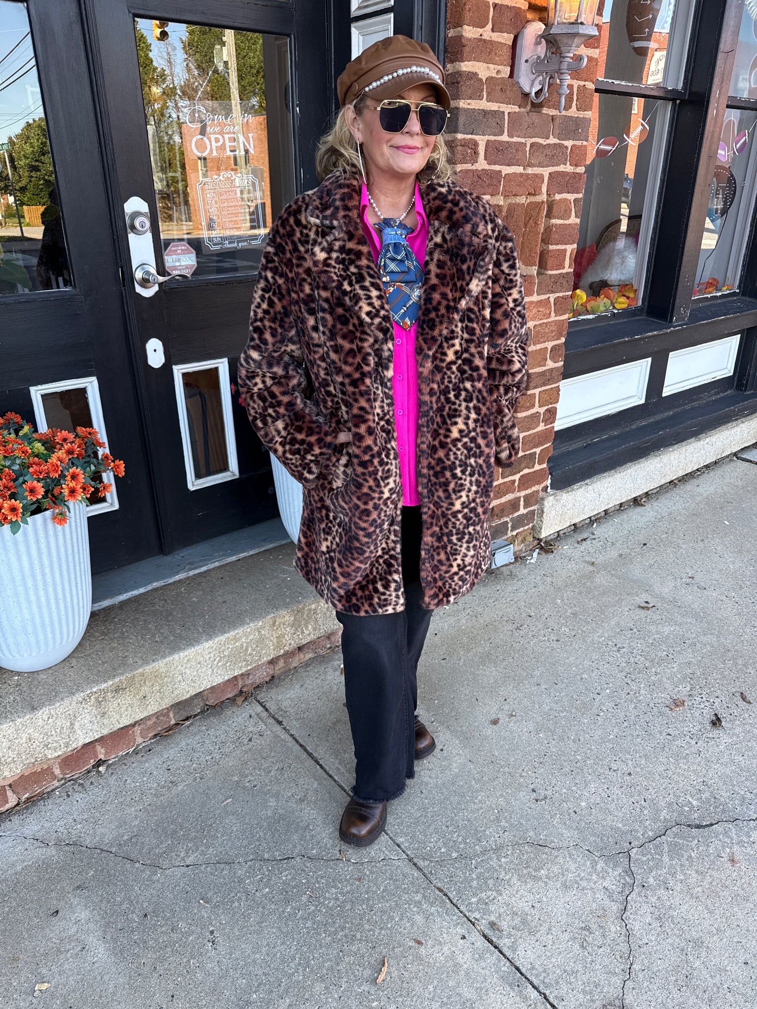 This knee-length coat features a luxurious faux fur lining, providing exceptional warmth and comfort for cooler days. Crafted in a striking leopard print, it offers a bold, stylish statement while maintaining practical insulation. Perfect for adding sophistication and edge to your seasonal wardrobe.