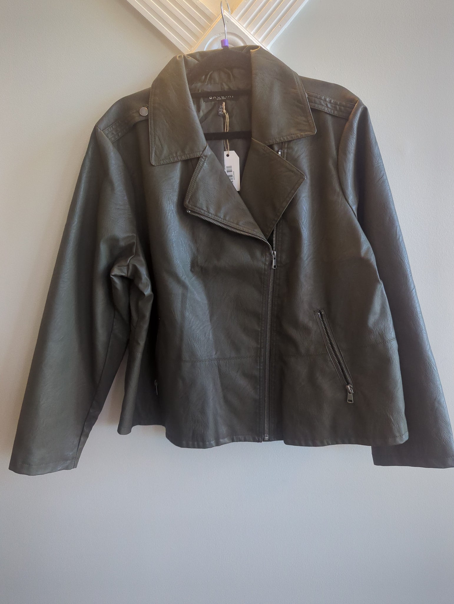 Crafted for curvy silhouettes, this Olive Asymmetrical Zip Vegan Leather Moto Jacket combines edgy style with ethical materials. Featuring a tailored fit and an asymmetrical front zipper, it offers a flattering shape while providing durable, cruelty-free comfort. Perfect for layering, this jacket delivers a polished yet bold look suitable for expert-level styling in any wardrobe.